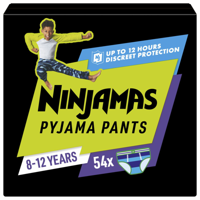 Pampers Ninjamas Maat 8 (8-12 jaar) JongenMaak kennis met … de Ninjamas Pyjama Pants! Pak bedplassen aan en word zelfverzekerd wakker dankzij bescherming tegen lekken, de hele nacht lang. De Ninjamas instant absorptie-technologie absorbeert vocht onmiddellijk voor een bescherming zoals je die nog nooit hebt gezien. De 360° tailleband past zich aan de taille van je kind aan voor een discrete en comfortabele pasvorm net zoals bij gewoon
