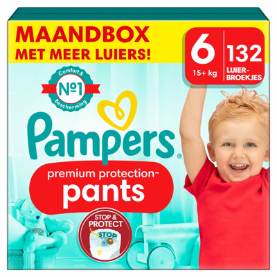 Pampers Premium Protection Luierbroekjes Maat 6 (15 kg+)Geef je baby Pampers N°1 voor comfort en bescherming met Pampers Premium Protection Pants luierbroekjes! Met een revolutionaire Stop & Protect pocket om lekken aan de achterkant te helpen voorkomen voor tot 12 uur bescherming rondom tegen lekken. Als je baby actiever wordt, wil je een luierbroekje dat zowel bescherming biedt als een comfortabele pasvorm heeft die zich aanpast aan alle bewegingen van je kindje. Daarom bieden de Pampers Premium Protection Pants luierbroekjes het beste comfort en de beste bescherming met een 360° comfortabele pasvorm dankzij superzacht en elastisch materiaal dat zich aan het lichaam van je beweeglijke baby aanpast.Net als alle andere Pampers luierbroekjes zijn de Pampers Premium Protection Pants luierbroekjes heel eenvoudig te verschonen: je trekt ze in één beweging aan, scheurt de zijkanten open om ze uit te trekken, rolt ze op en gebruikt de plakstrip om ze weg te gooien, ook als je baby de hele tijd beweegt. Net zoals bij jou, komt jouw baby’s veiligheid bij Pampers op de eerste plaats: Pampers Premium Protection Pants luierbroekjes zijn dermatologisch getest en bevatten 0% EU-parfumallergenen (zoals gereglementeerd in de regelgeving voor